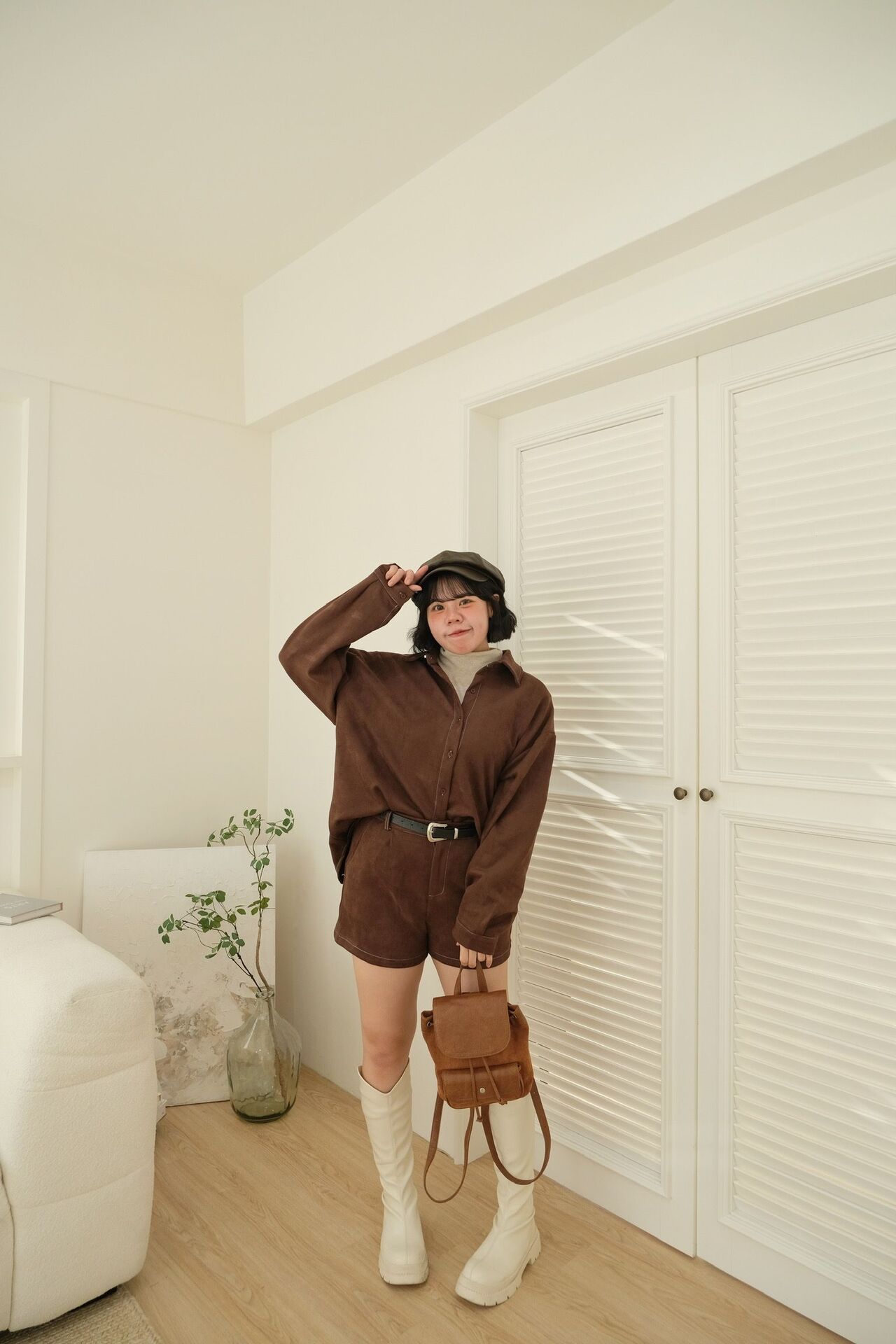 襯衫是帶微厚度的麂皮絨布料 柔軟不生硬 上身稍微有點挺度卻不會撐身材 近看有細緻霧面光澤 屬於低調質感款💞